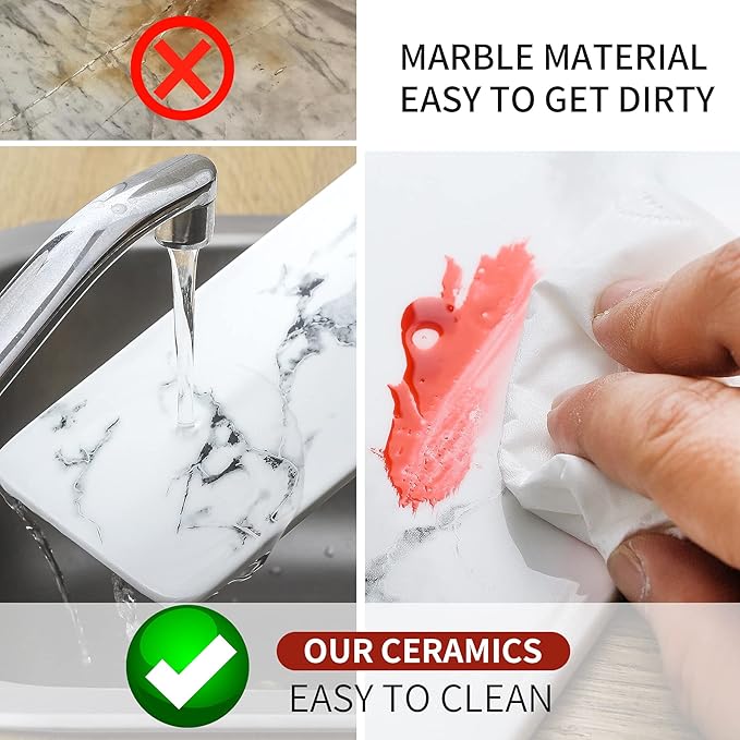 - EASY TO CLEAN: With a sturdy stainless steel frame that can prevent corrosion in wet places and removable ceramic trays with a luxurious marble pattern, this dresser top stand is both functional and easy to clean.