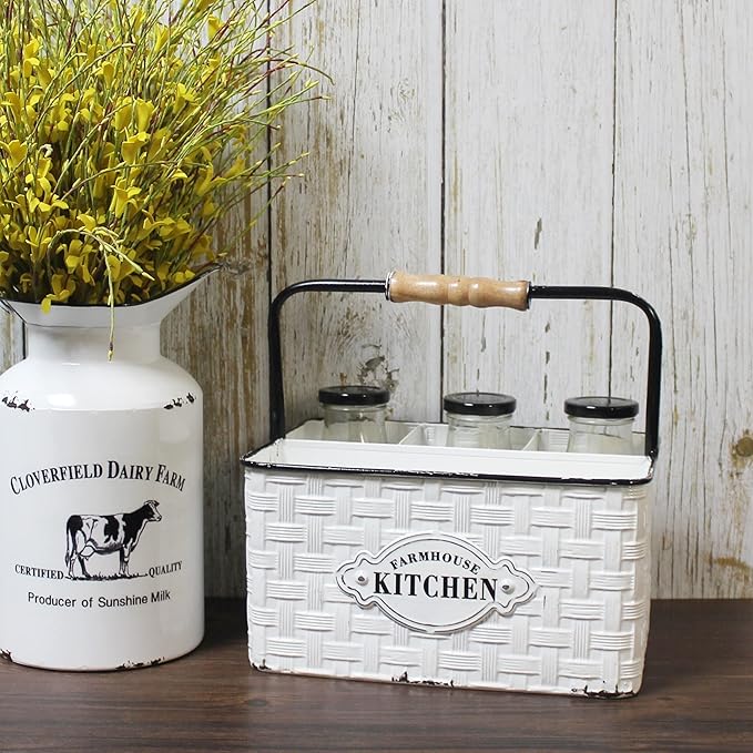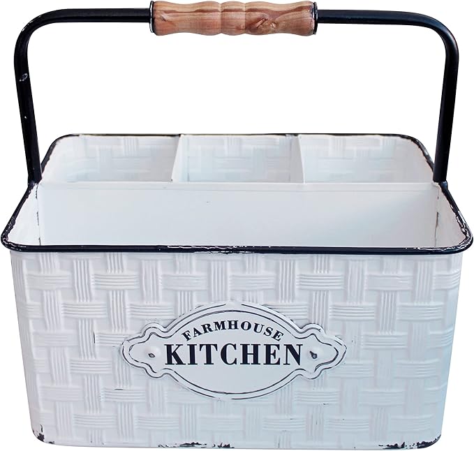 CVHOMEDECO. Rustic Distressed Metal Silverware Organizer Utensil Caddy, Flatware holder, Tabletop Organizer, Enamel Finish with Wood handle and 4 Compartments, White