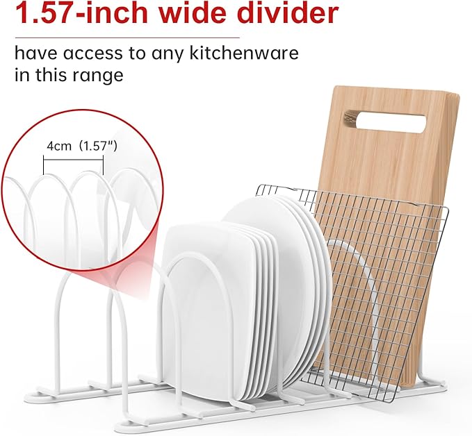 - √ 【6 Dividers】Help you to separate lids, pans, dishes, cutting boards, cookbooks and more