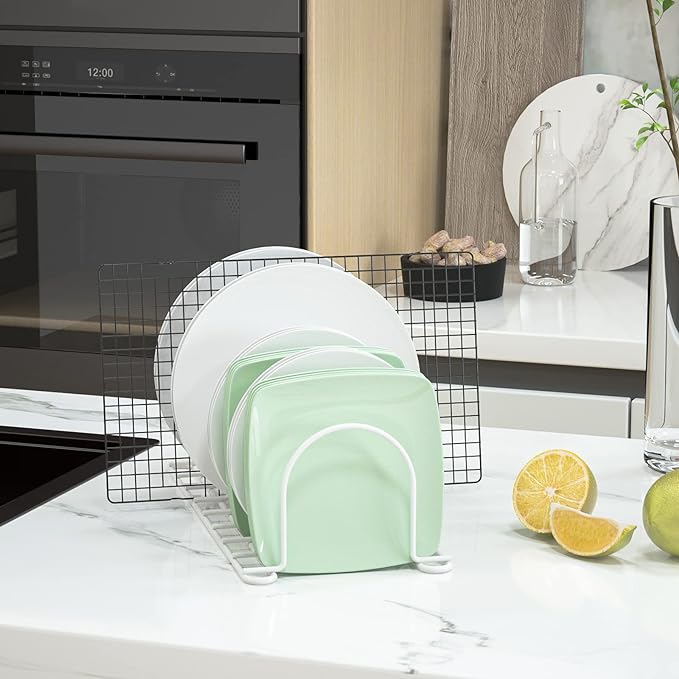 - √ 【Keep your cabinets well-organized 】The plate rack can store your pots lid,cutting board, cookie sheets , pans , bakeware , file folders,reusable bags and bee wraps orderly