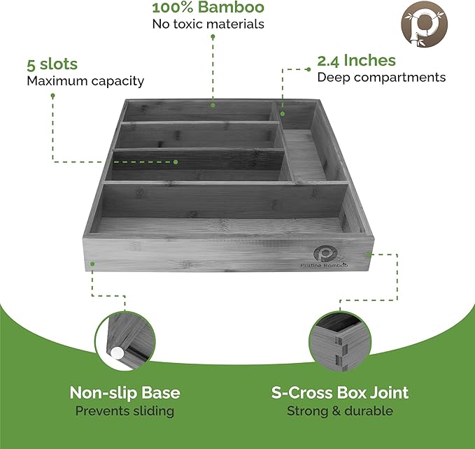 - DESIGNED WITH YOU IN MIND: This sleek and stylish drawer storage organizer is the perfect way to maximize your kitchen space. With 5 different compartments, it can accommodate all those pesky pieces that tend to get lost. The Pristine Bamboo utensil drawer organizer also features an interior depth of 2 inches with the perfect size of 13.5 x 9.8 inches.