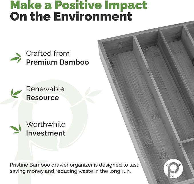 - STORAGE SPACE PROBLEMS SOLVED: Why not use the space in your kitchen drawers to store all those utensils? With Pristine Bamboo sleek, stylish kitchen utensil organizer for drawers, you'll be able to put away larger tools like spatulas and whisks while still having plenty left over for smaller gadgets.