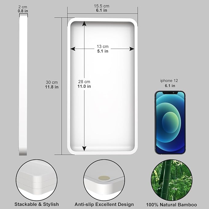 Weenson Bathroom Vanity Tray for Countertop Toiletries Makeup Decor Perfume Candles, Kitchen Tray for Soap Dispenser Spice Salt Coffee, Toilet Tank Tray Bamboo11.81” L x 6.1” W x 0.79” H (White)