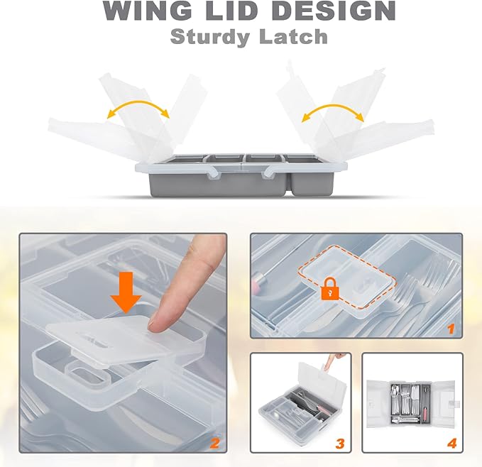 Portable Utensil Holder for Countertop with Lid & Handle, Plastic Silverware Tray for Drawer Flatware Organizer, Gray