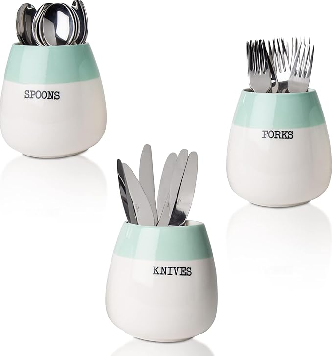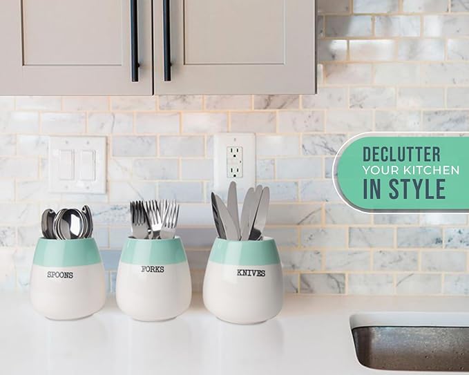 - Sturdy and Decorative - Made from premium quality ceramic, this cutlery holder is a beautiful and functional addition to your kitchen. Measuring x inches long and x inches tall, this mason jar set will organize your flatware in style.