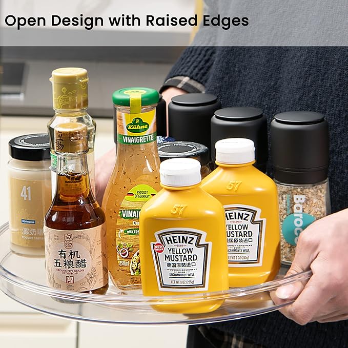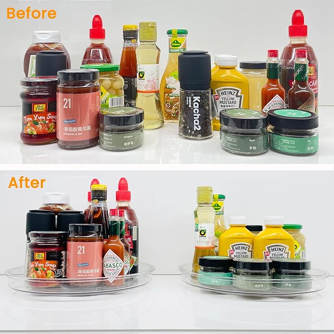 - 【IDEAL SIZE FOR YOUR DAILY USE】Meet your different storage needs. No assembly required. Turntable organizer measures 13 × 13 × 1.5 inches NOTE: CANNOT BE USED IN DISHWASHER. Clean with warm soapy water.