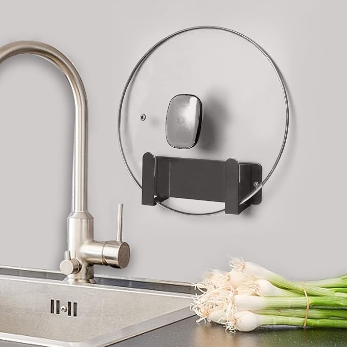 Pot Lid Rack, Wall Mounted 304 Stainless Steel Pan Lid Organizer Holder, Self Adhesive, Kitchen Cooking Utensil Tool (Black, Set of 2)