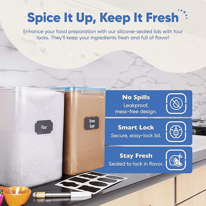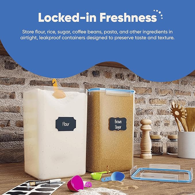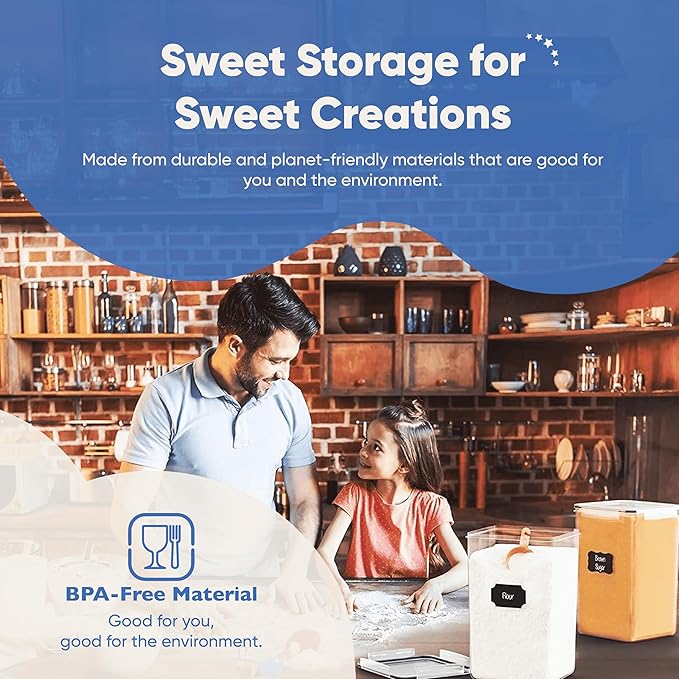 - Durable, BPA-Free & Stain-Resistant. Made from top quality, food-safe material, our plastic food containers resist stains and odors. Designed for daily use, our canisters for flour or sugar are dishwasher-friendly and perfect for pantry organization.
