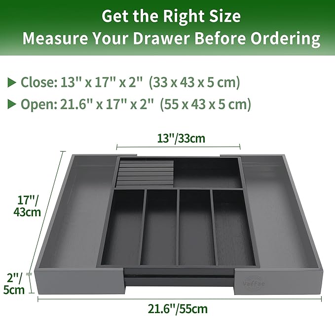 - Adjustable design: VaeFae large silverware holder is expandable from 13" to 21.6" wide to fit different drawers; You can expand on one or both sides for customized use
