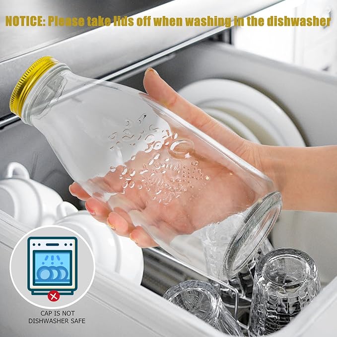- Dishwasher Safe Bottle: The heavy glass milk bottle set allows the vibrant juice colors to show. The bottle is dishwasher safe without the canning lid. Easy to hand wash.