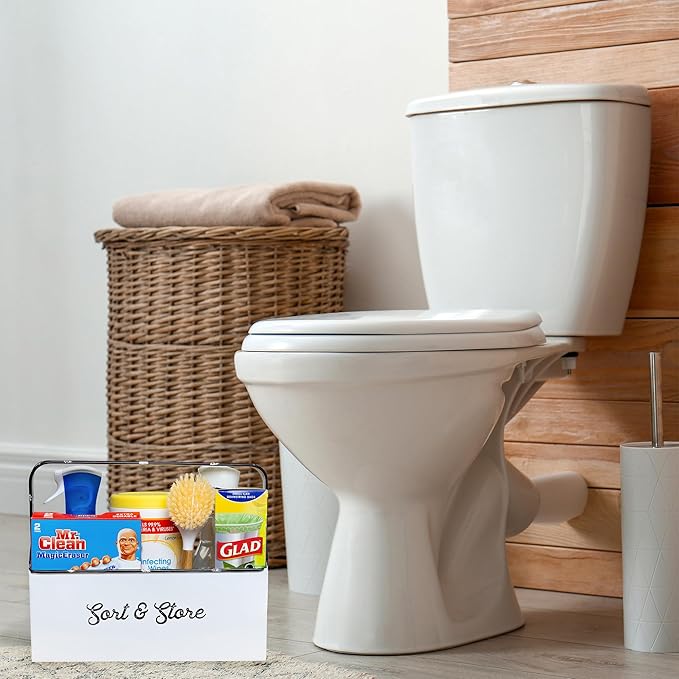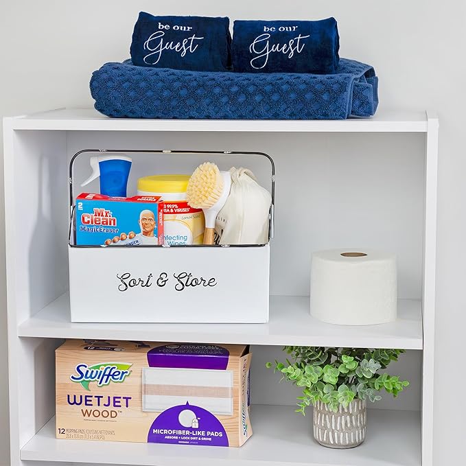- SIZE: 11.9 x 6 x 10.6 inches; COLOR: Distressed white with script “Sort & Store” in black print