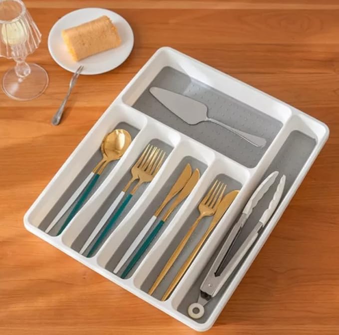 Large Silverware Tray - White, Kitchen Cutlery Tray Drawer Organizers 6-Compartments| Kitchen Drawer Organizer | Soft-Grip Lining and Non-Slip Rubber Feet | BPA-Free