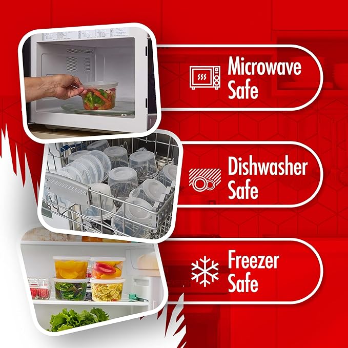 - Pack of 50 - Durable heavy duty, BPA free plastic container. Containers and lids are microwave-safe, freezer safe, dishwasher safe (top rack recommended), stackable, reusable and leak proof