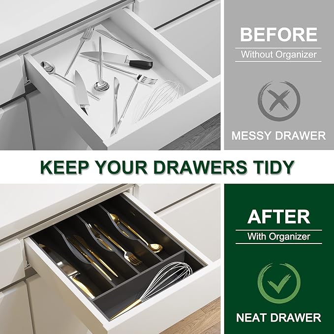 - ✅【Keep all you need at hand】Stop worrying about finding utensils when you cook. 5 deep compartments make our silverware organizer a good assistant for cooking. When all every cutlery is neatly arranged in our drawer cooking is also become easier. Clear your flatware & utensil and enjoy cooking with a cheerful heart.