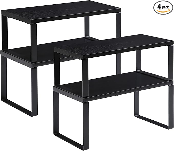 YMYNY Cabinet Shelf Organizer, Spice Racks Set of 4, Kitchen Counter Shelves, Stackable, Wood, Cupboard Organizer for Dishes, Seasoning, Cans, Coffee Mugs, Black, HSR002B-2