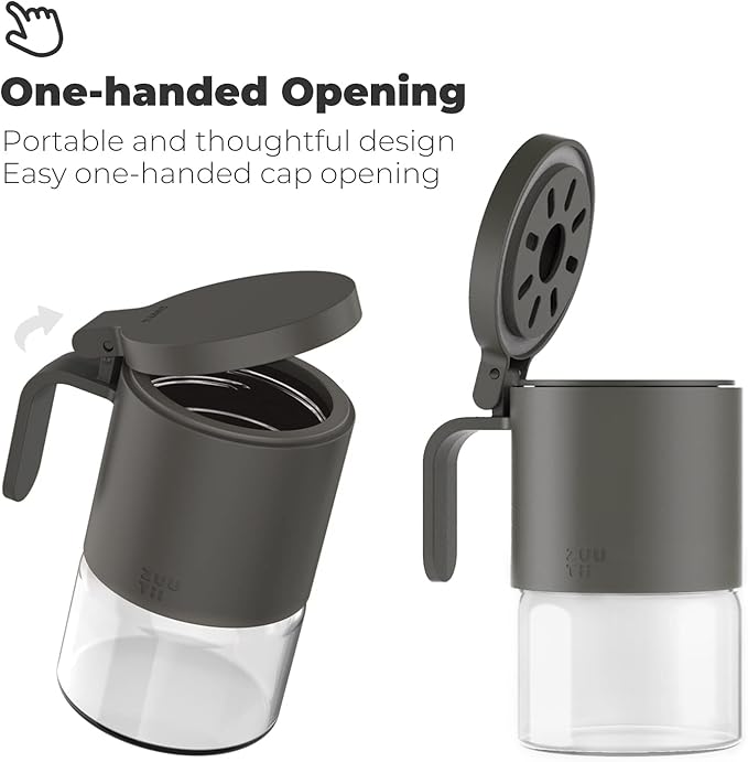 - 【CONVENIENT ONE HAND OPERATION】The built-in silicone ring seals the jar to keep it dry. The flapper cap on the spice jar allows you to easily open it with one hand. This is especially convenient while the other hand is busy cooking. No need for twist-opening making it more effortless.