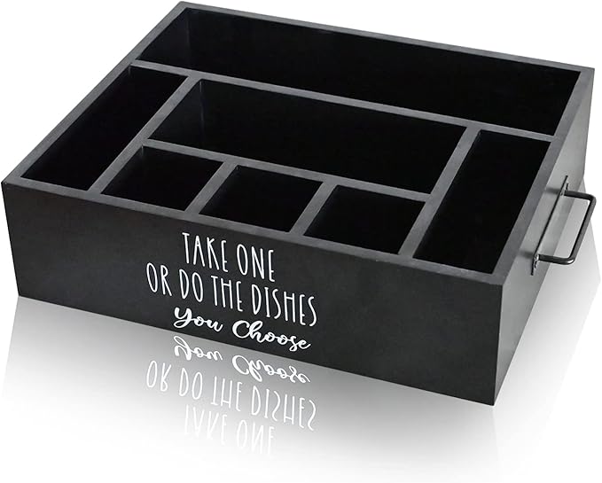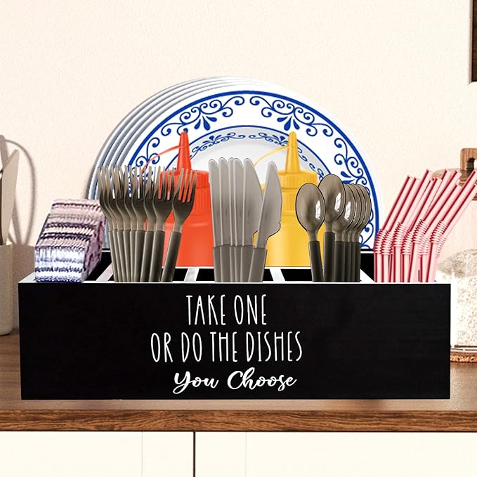 - 7 COMPARTMENTS --- 1 rear compartment for plates. Left and right two compartments can be used to put napkins and straws. The middle compartment can be used to put cups.3 front compartments for utensils.
