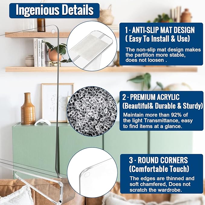 - These acrylic shelf dividers are crafted from premium acrylic and the clips on the bottom are reinforced and thickened for long-lasting durability. All edges are rounded and smooth to avoid scratching your shelves or clothes.