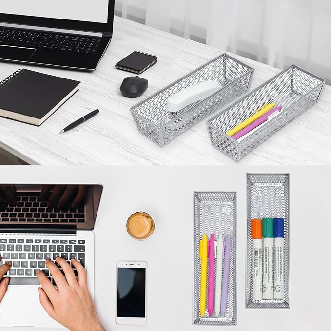 Silverware Organizer,Mesh Drawer Organizer for Kitchen,Metal Utensil Organizer for Flatware, Knives, Spoons,Cosmetic (Silver 9 * 3 * 2 inch Pack6)