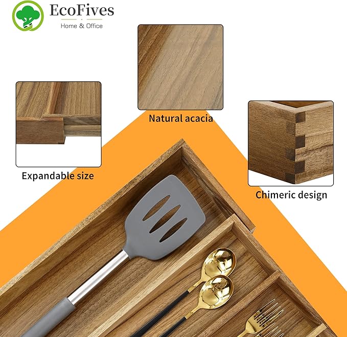 - Multipurpose Storage Scenarios: EcoFives drawer silverware organizer with exquisite craftsmanship can be placed into any drawer and pick up the items you need for use, which helps you to see everything at a glance and keep away from messy. Keep all the kitchen gadgets in the right place. A nice acacia kitchen utensil holder organizer is perfect kitchen drawer organizer for home
