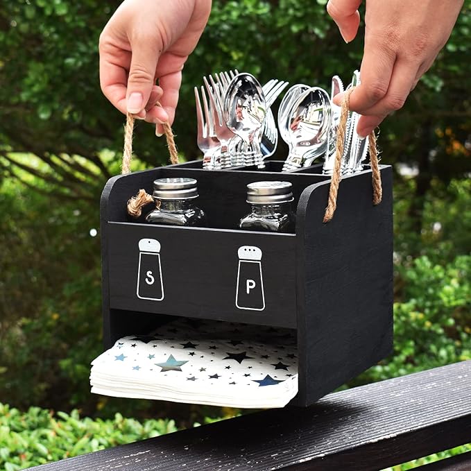 Ikee Design Wooden Utensil Caddy with Handles, Includes Salt Pepper Shaker,Silverware Caddy,Silverware Holder Organizer for Countertop,Party,Camping and Kitchen,Picnic Cutlery Holders,Black Color