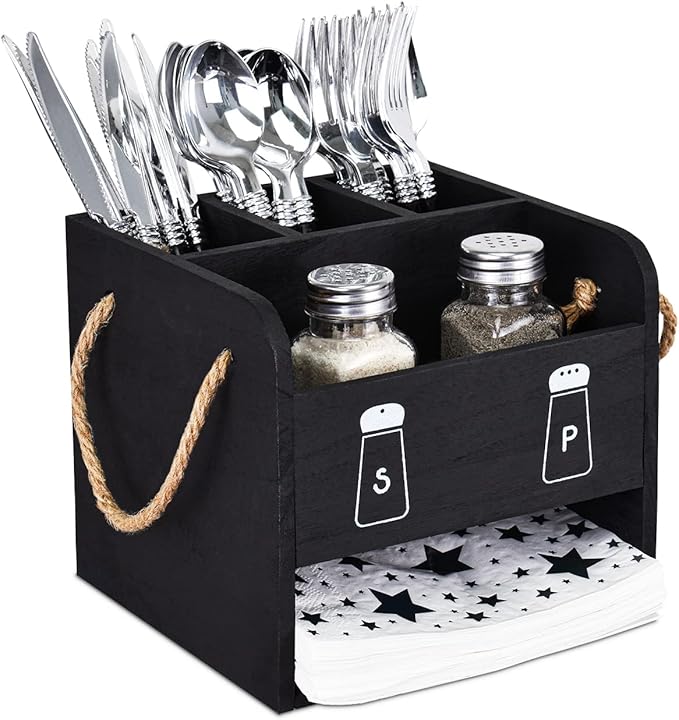 - WOOD UTENSIL HOLDER NAPKIN CADDY - Total 5 compartments : 3 Deep Slots for Silverware, Front Compartment for Free Salt/Pepper Shaker, and a Convenient Space Underneath for Napkin Holder.