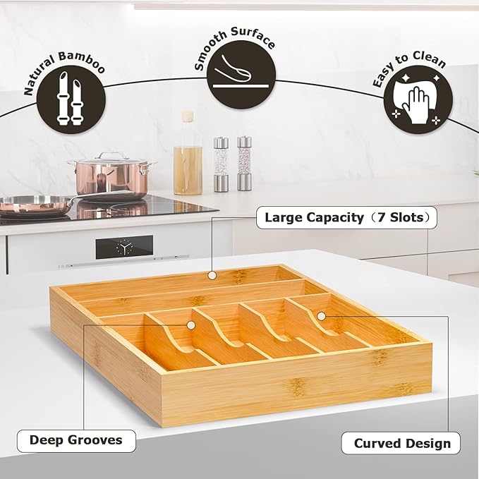 - 【Kitchen Storage】: This beautiful 7-compartments cutlery organizer has 2" deep compartments and a reinforced base; the seam between the divider and the tray is stable and crack-free; dividers with curved design allow easy access to cutlery. Kitchen storage just got a whole lot easier.