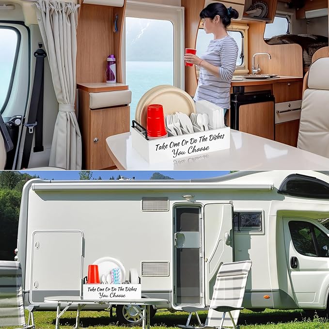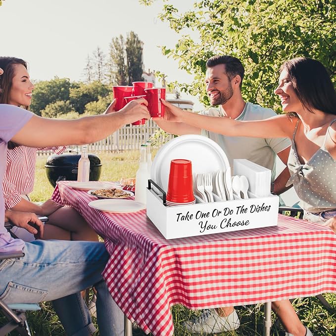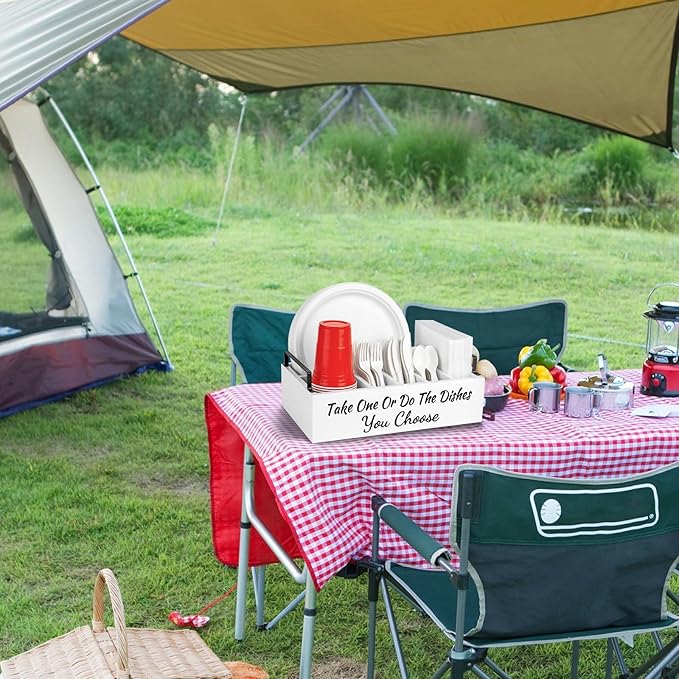 - 【Silverware Caddy for Camping and Picnic】This picnic caddy has enough room for all your camping/picnic needs, it's a convenient way to put paper plates, silverware, cups and napkins in this organizer. Everything is in this organizer and easy to grab