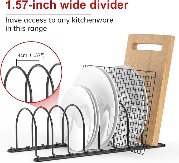 - √ 【8 Dividers】Help you to separate lids, pans, dishes, cutting boards, cookbooks and more