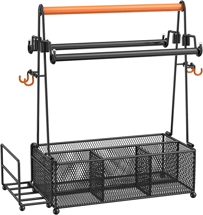 - [PORTABLE & CONVENIENT]The reasonable handle design can balance the outdoor utensil caddy well, not easy to tilt or knock over during use. Easy to carry condiments and utensils to outdoor barbecues, RVs, and yards. The paper roll holder, napkin holder, and hooks are all removable and can be disassembled to save space according to your needs.