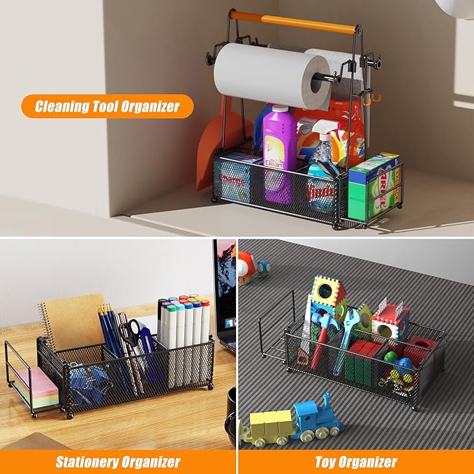 - [IDEAL CONDIMENT CADDY]This silverware holder consists of 4 compartments with 2 paper towel roll holders, 4 hooks, and a removable napkin holder. The logical partition design makes it easier to store forks, spoons, knives, plates, napkins, condiments, grill tools, and other supplies, ideal for a cutlery caddy.