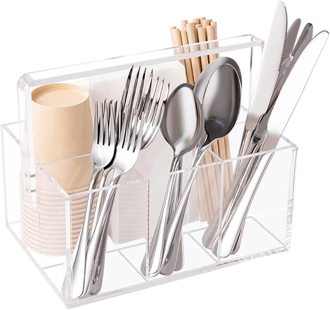 - MODERN CONTEMPORARY LOOK - Our cutlery holder will bring the perfect touch to your counter, table or kitchen decor. The clear acrylic silverware holder for countertop organization will impress all.