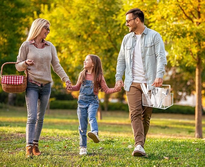 - EASY ASSEMBLY - Just screw the handle in, add napkins forks spoons knives cups plates chopsticks straws and kitchen accessories to our utensils basket, place on your countertop, party buffet.