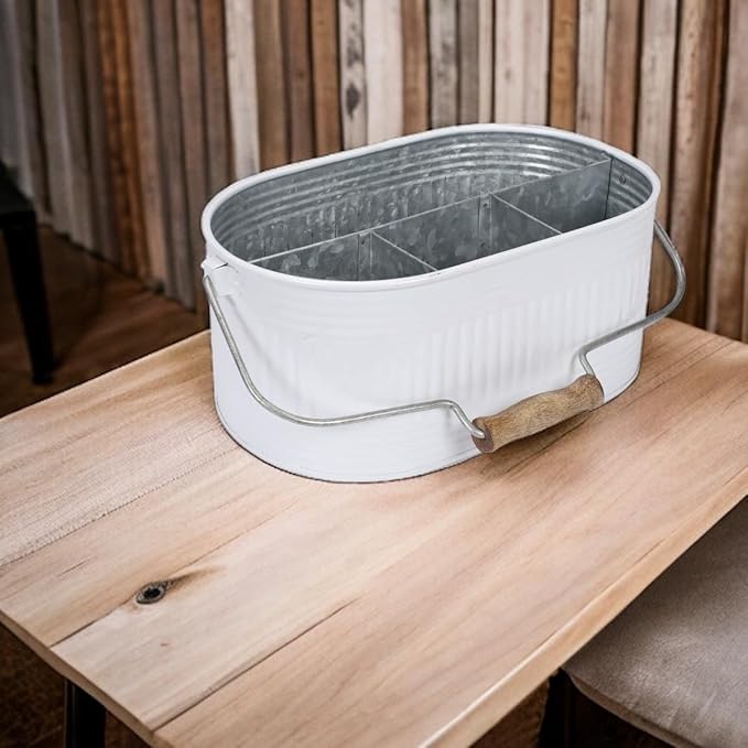 CLEENTABLE Galvanized Utensil Caddy – Rustic Farmhouse Chic Multi-Compartment Organizer for Kitchen, Parties & Picnics (13.5" L x 10" W x 5.5" H)