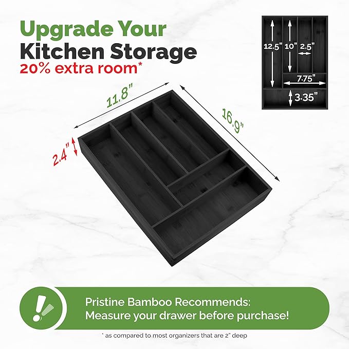 - SLIP RESISTANT & DEEPEST in the market: The only silverware drawer organizer that is slip-resistant and 2.4" deep. This deep silverware tray Increases storage capacity in your kitchen drawer to best fit a variety of utensils (internal depth 2”). The non-slip silicone feet keep your bamboo utensil holder in place. So don’t worry, your flatware organizer tray will not move to the back of the drawer ever.