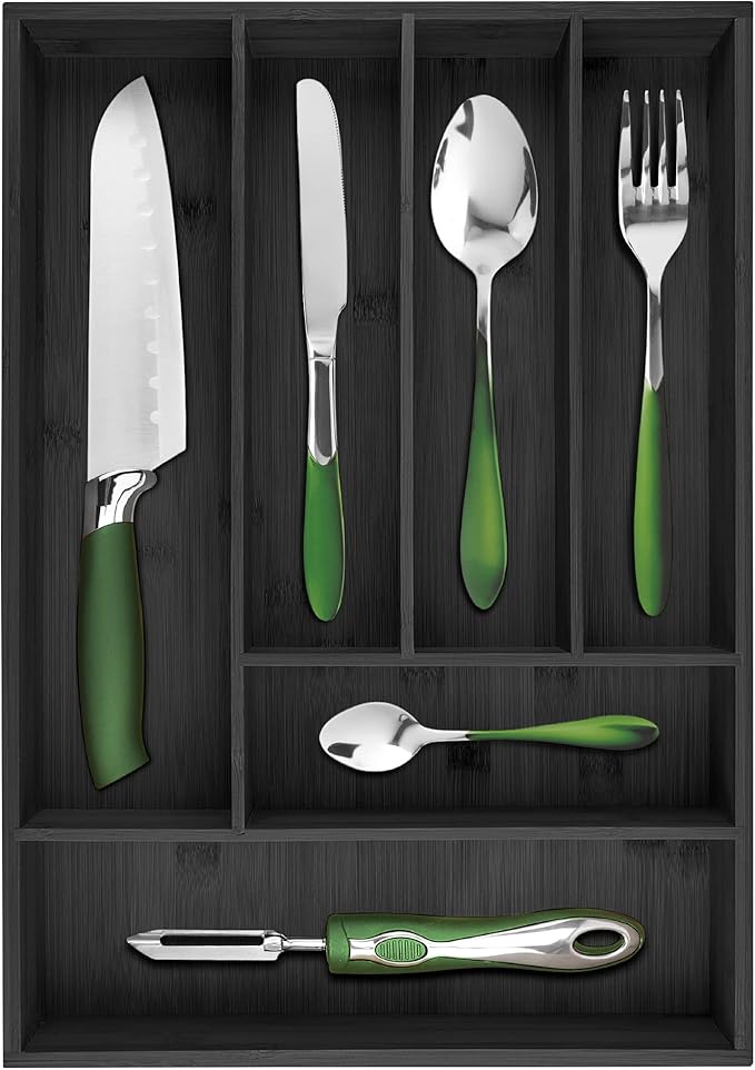 silverware tray organizer– Flatware Utensil Cutlery Silverware Holder for Drawer – Small Extra-Deep Wooden Kitchen Drawer Organizer Divider for Spoons Forks Knives (6-Slots, Black)