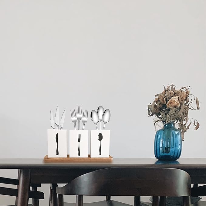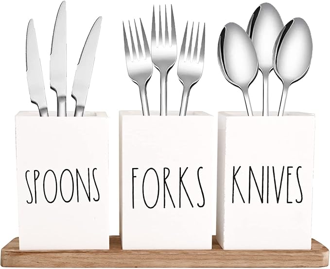 - FARMHOUSE DESIGN --- These wood utensil holders are designed with farmhouse style patterns and fonts of spoon, knife and fork, so that you can be told which compartment you should to put with these clear instructions, making your kitchen in order, also easy for you to get the corresponding silverware you want.