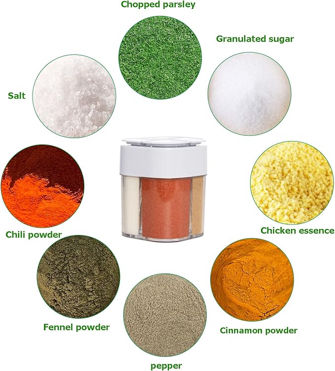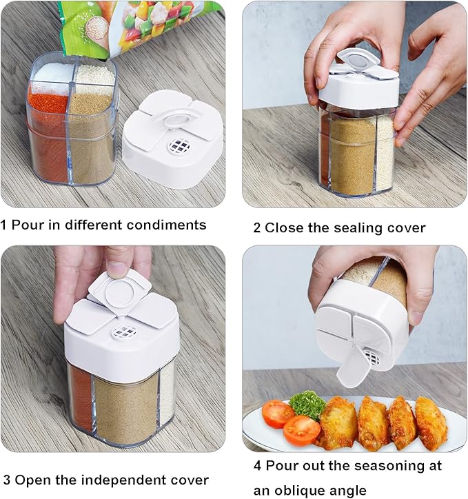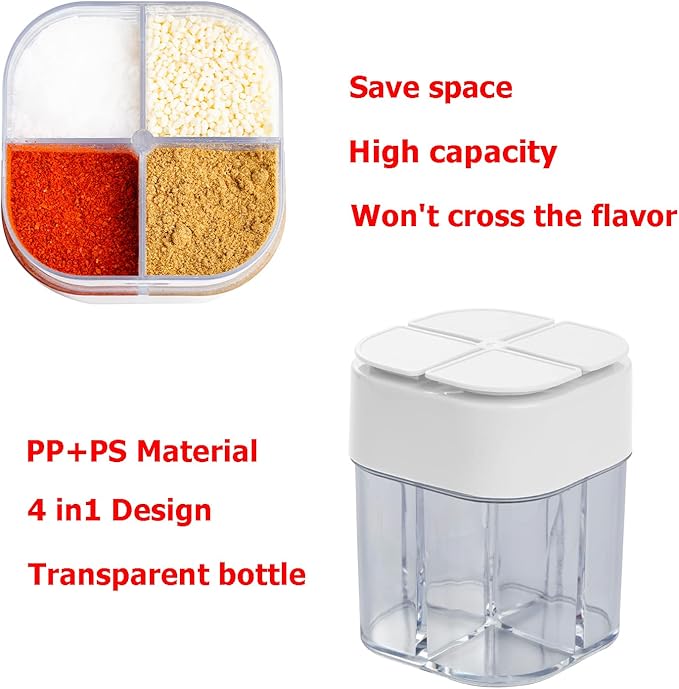 - 4 in 1 Design:Spice container with compartmentalized design, which can store 4 different seasonings meanwhile,each jars is fitted with a separate lid,so it won't cross the flavor for long-term storage.