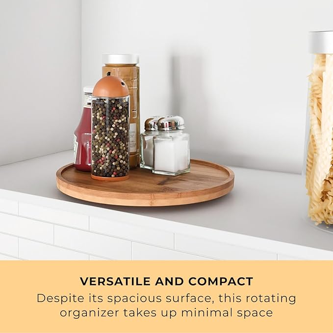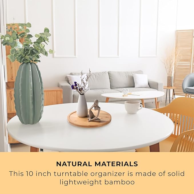 - Natural Materials - This 10x10-inch turntable organizer is made of solid lightweight bamboo. The natural finish of the bamboo will complement almost any home decor.