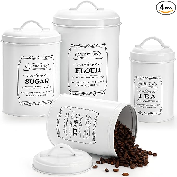 - Farmhouse Kitchen Decor: Set of 4 kitchen canisters labeled with a stylish vintage print, add white rustic style and functionality for the kitchen accessories organization on countertop and coffee bar.