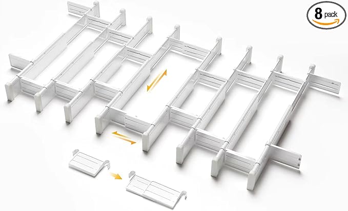 - Custom Free Combination: 8 PACK are 8 long dividers and 16 short dividers. After maximum stretching, they can be used in a 22.8" * 48" drawer. Each long divider is 12.9"-22.8". Please purchase a suitable set after measurement. The ingenious short dividers can also be disassembled into two small pieces