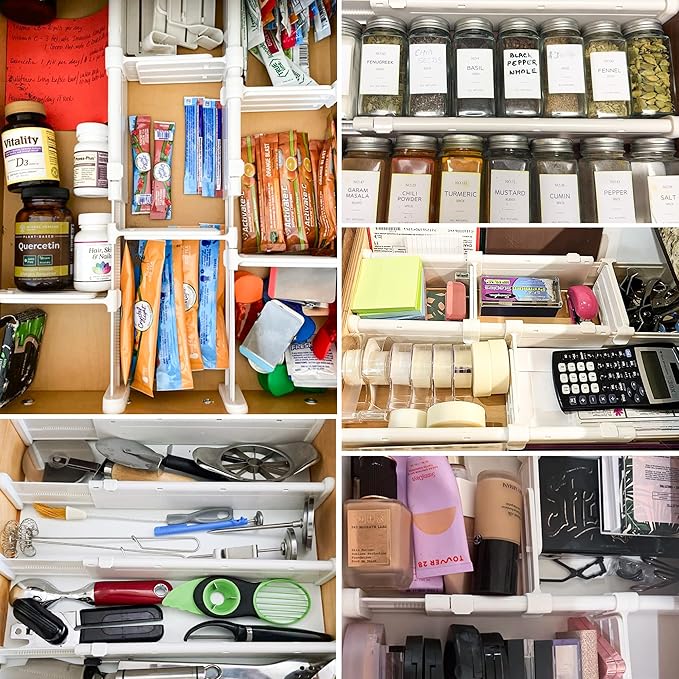 - Long Lasting & Stable Grip: To ensure the most lasting stability of the dividers, we adopt the serrated design to fix instead of the spring structure on the market. So there is a pull tab on the long divier which need to be pushed from the bottom to the top with our thumb. There are also foam pieces covered on kitchen drawer dividers that are a nice touch for grip. Protect the drawer from scratches, leaving no traces or residues