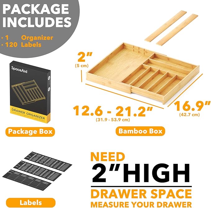 - ORGANIZED AND BEAUTIFUL - Make your kitchen drawer neat and organized with bamboo silverware organizer. The utensil organizer is designed for your different silverware kitchen storage organization; SIZE: 16.9"L x 12.6"-21.2"W x 2"H