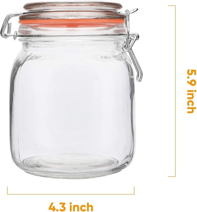 - Complete Set:Comes 6 pack of airtight wide mouth glass jars in a safety package,these 32 oz glass jars are 5.9” tall and 4.3" at bottom,got pen and stickers and an extra rubber seal ring replacement for each jar,use it to storage your home and kitchen now!make a organized neat home,great shaped to fit perfectly for your kitchen pantry.