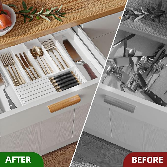 - 【3-in-1 Organizer】: Kitchen Drawer organizer with steak knife holder, no assembly required. It can store kitchen utensils, knives and silverware together, which can effectively complete the kitchen organization work and keep your tableware in order, beautiful and tidy.