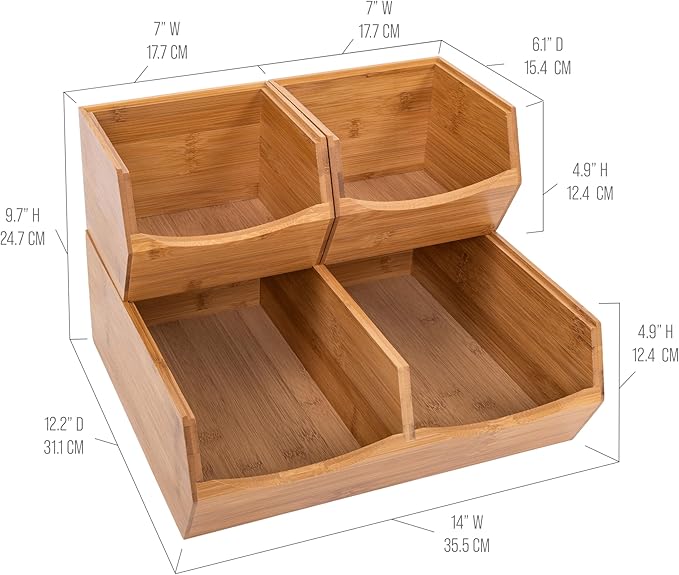 - STACKABLE 3 PACK - Includes 3 stackable bamboo organizer bins with stacked dimensions of 14” W x 12.25” D x 9.75” H