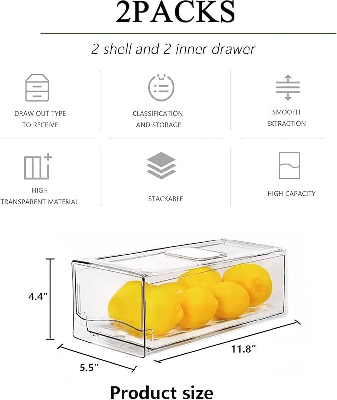 - 【𝐒𝐢𝐳𝐞 𝐟𝐨𝐫 𝐌𝐮𝐥𝐭𝐢𝐩𝐥𝐞 𝐔𝐬𝐞 】Stackable fridge drawers are made of PET plastic. Measures:2 SMALL SIZE - 11.89 x 5.5 x 4.2 (outer) 11.22 x 4.96 x 3.4 (inner) .This containers for fridge can be used to organize foods in kitchen and refrigerators, office supplies, bedroom clothing and skin care products, and bathrooms.