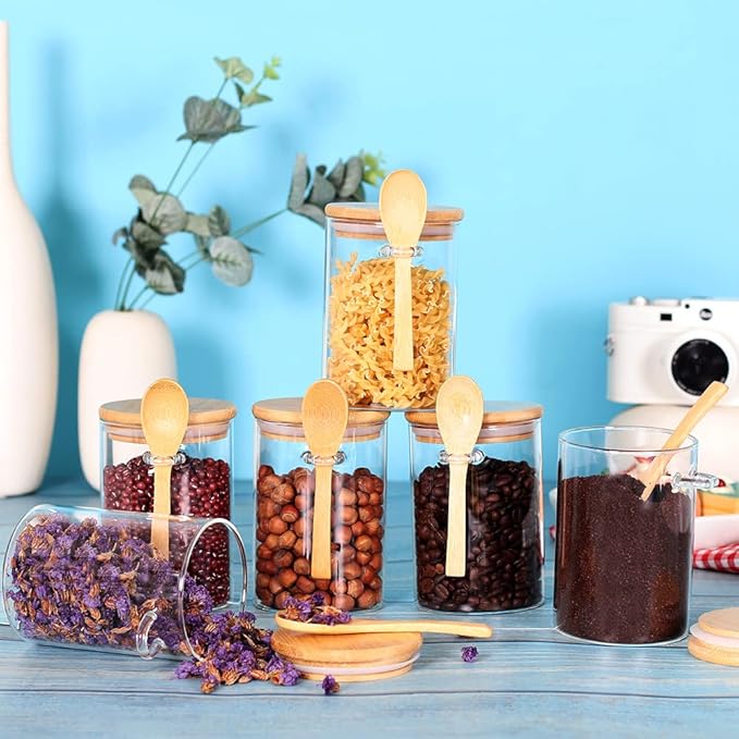 - [Highly Glass] The glass jars with bamboo lids and spoon are made of high-quality borosilicate glass and BPA free silicon which withstand temperature 0℉ to 400℉, you can put this airtight food canister in the pantry, kitchen corner or fridge.