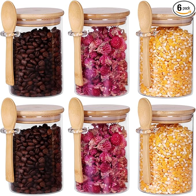 Glass Jars with Bamboo Lids and Spoon Set of 6, 17 OZ Coffee Sugar Container Set with Scoop, Overnight Oatmeal Jars Containers with Lids and Spoon for Loose Tea, Yogurt