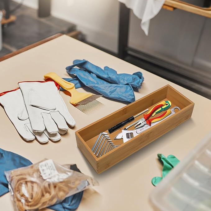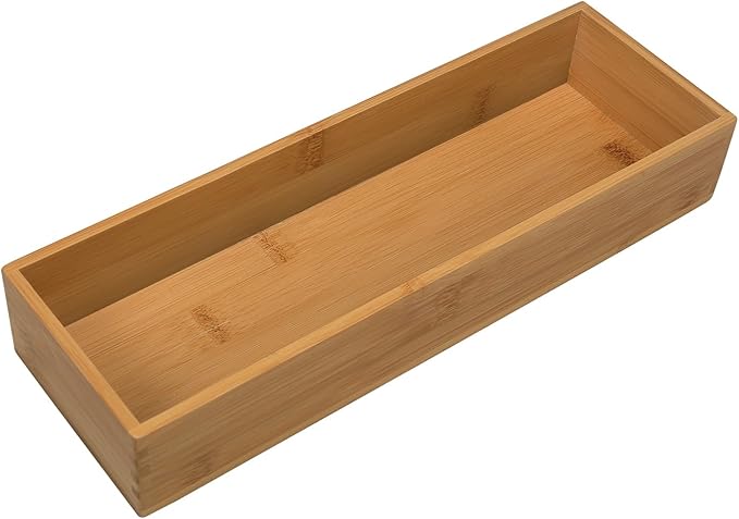 - Muti-Functional Drawer Organizer - This bamboo storage box can be used for dressing table to store cosmetics, lipstick, nail polish, jewelry, etc.; for desk to store writing tools, remote control, cell phone, ruler, calculator, etc.; for kitchen to store kitchen utensils knives, forks, spoons, etc. Organize your belongings in an orderly manner with powerful practicality